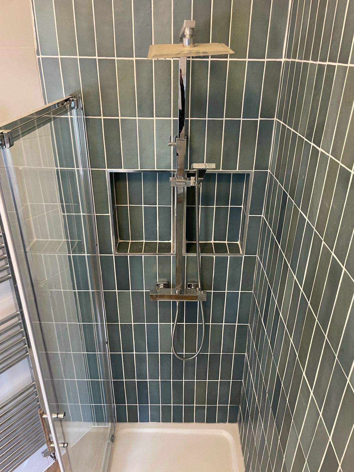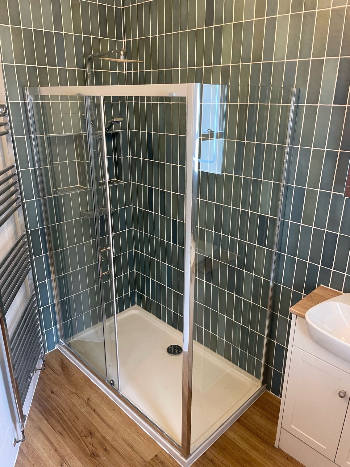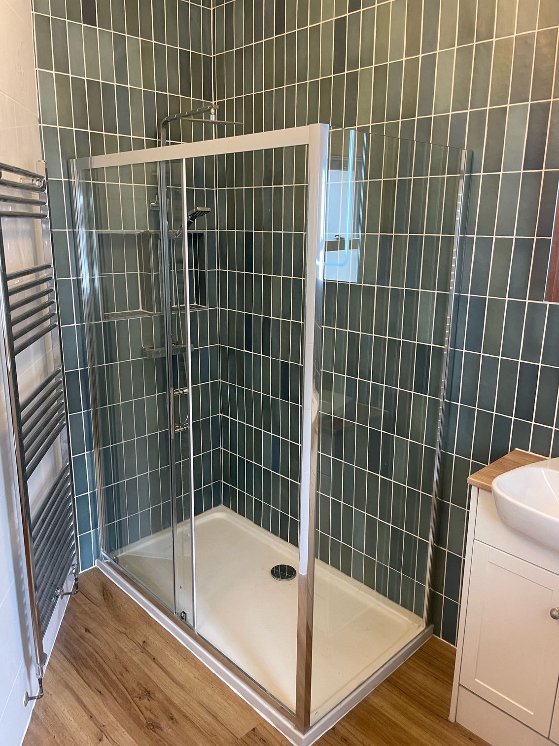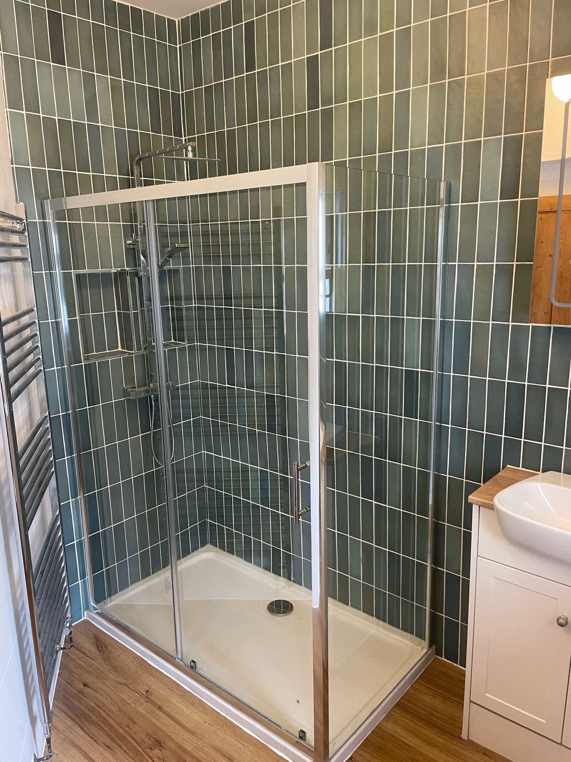 This bathroom renovation in Newport, South Wales, combines a fresh, modern layout with practical everyday design. Green vertical metro-style wall tiles add texture and colour to the space, creating a stylish feature around the shower area while keeping the room bright and contemporary.