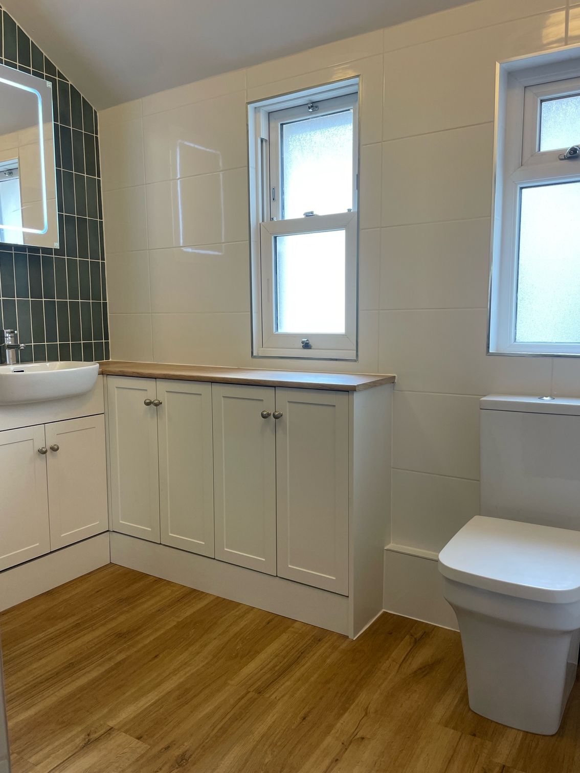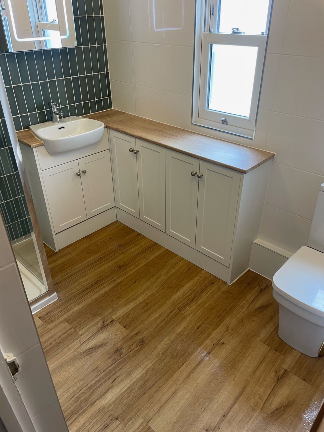 A spacious corner shower enclosure has been installed alongside a clean, modern bathroom suite, offering comfort and functionality. The fitted vanity units provide generous storage, finished with warm wood-effect worktops that complement the LVT flooring beautifully. The flooring not only enhances the overall look but also offers durability and easy maintenance.