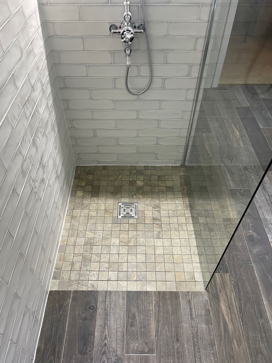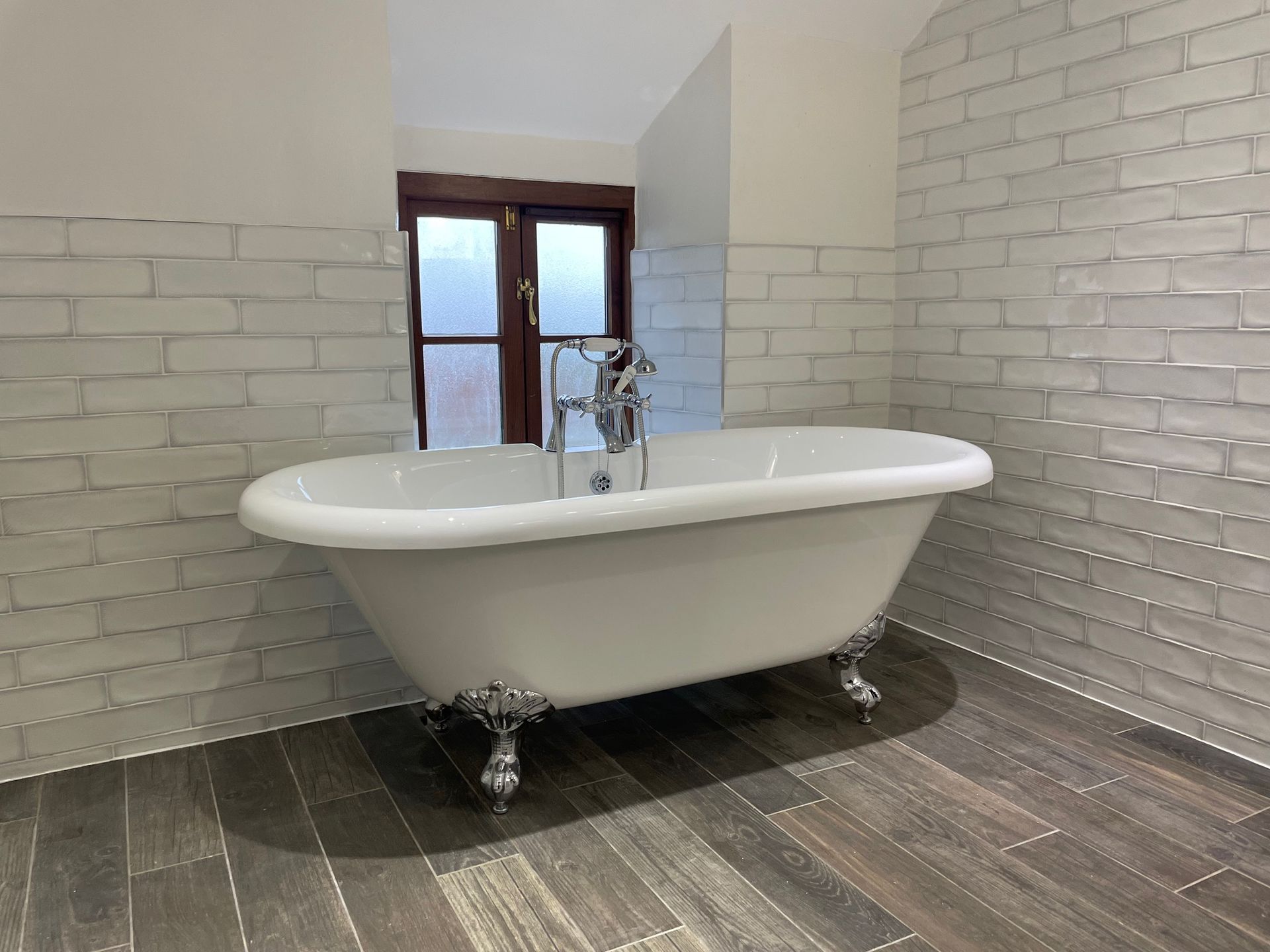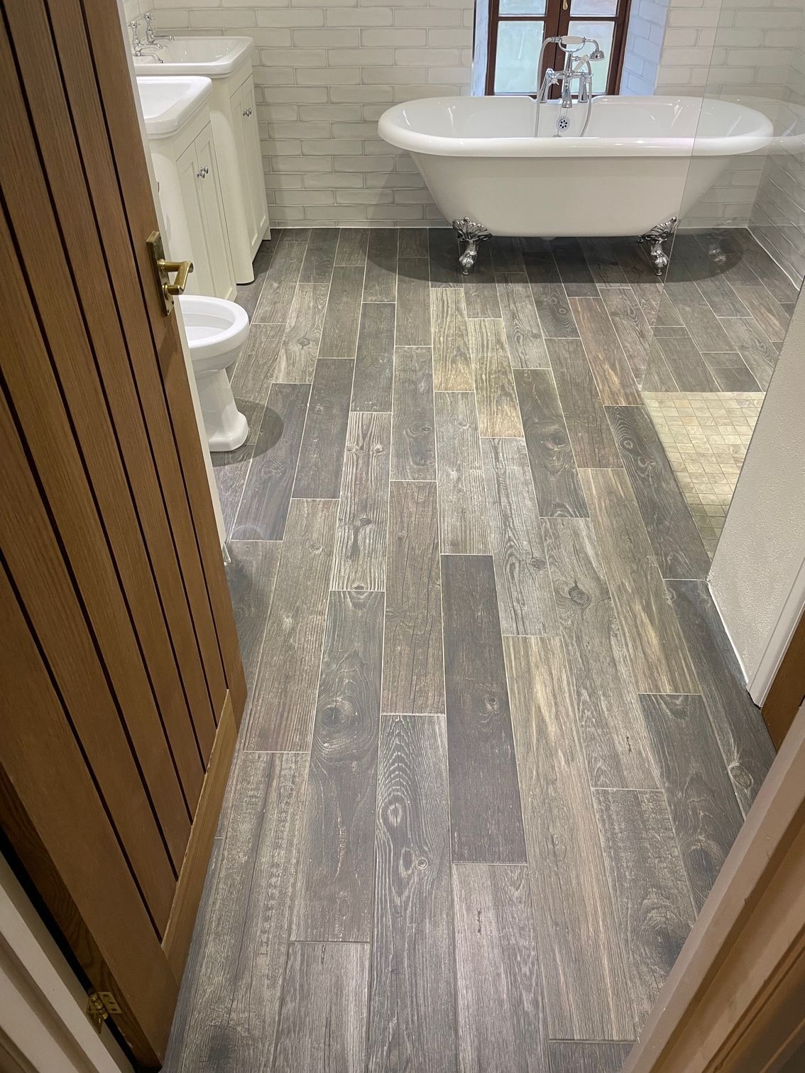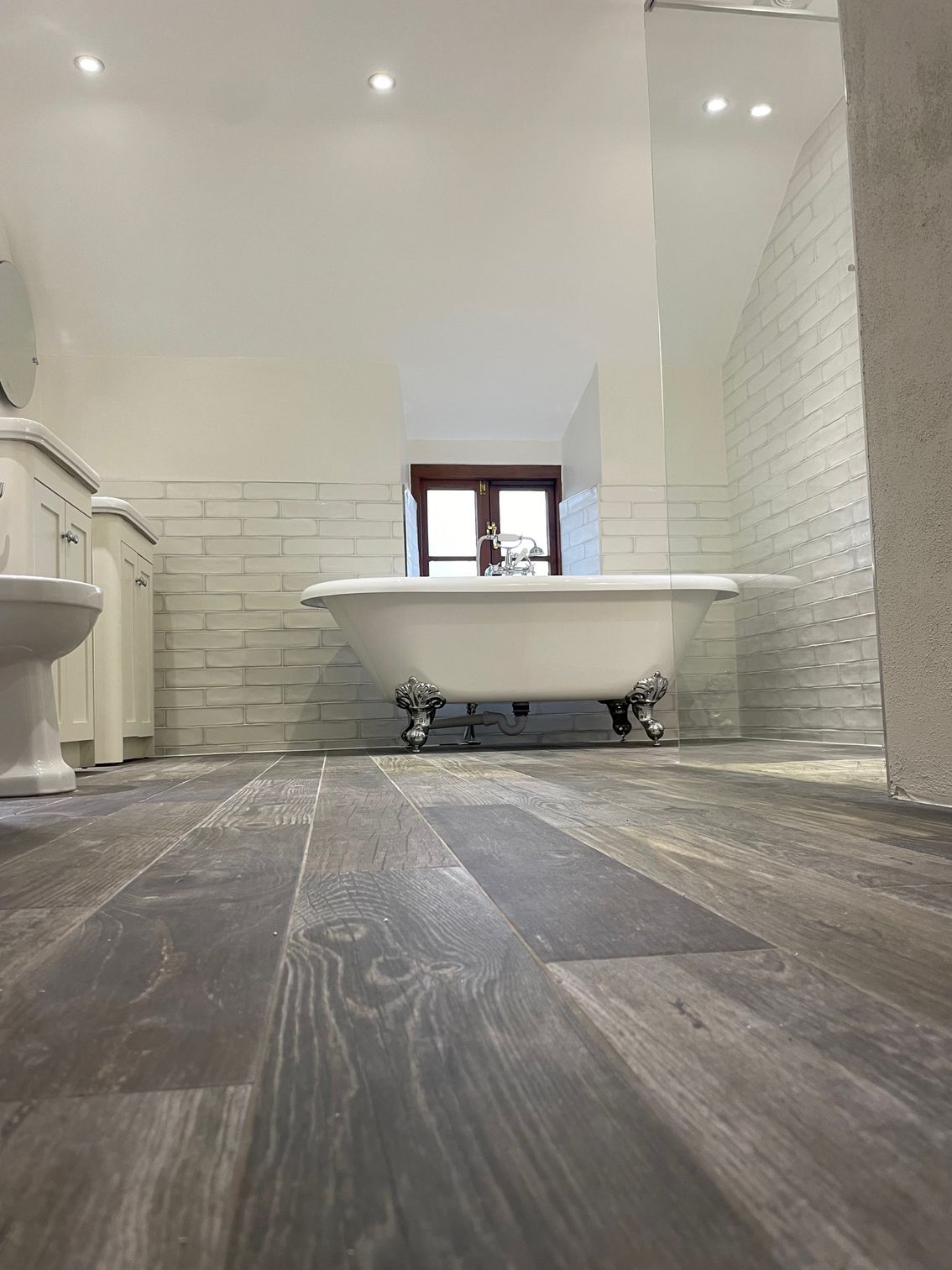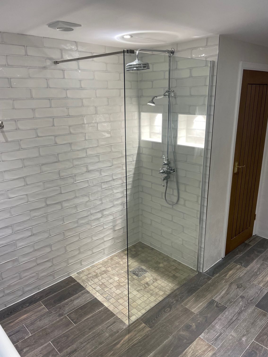 The bathroom features a freestanding roll-top bath as a focal point, paired with a spacious walk-in shower finished with a clear glass screen. Gloss white metro wall tiles help reflect light and keep the room feeling open, while wood-effect floor tiles add warmth and contrast. A mosaic-tiled shower base provides both visual interest and excellent drainage.